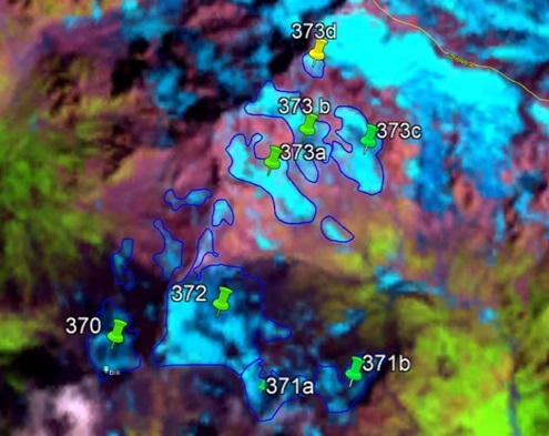 სურ. 15. №370 − 373 მყინვარების კონტურები: ა − ტოპოგრაფიული რუკის მიხედვით, ბ − Landsat 7 ETM+ სენსორის 2010 წლის 31 აგვისტოს სურათის მიხედვით, გ − Landsat 8 OLI TIRS სენსორის 2015 წლის 5 სექტემბრის სურათის მიხედვით, დ − Landsat 8 OLI TIRS სენსორის 2020 წლის 11 სექტემბრის სურათის მიხედვით.