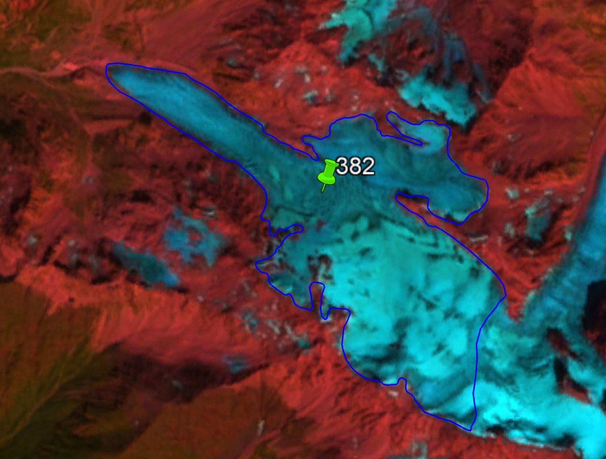 სურ. 18. №382 (კირტიშო) მყინვარის კონტურები: ა − ტოპოგრაფიული რუკის მიხედვით, ბ − Landsat 7 ETM+ სენსორის 2010 წლის 31 აგვისტოს სურათის მიხედვით, გ − Landsat 8 OLI TIRS სენსორის 2015 წლის 5 სექტემბრის სურათის მიხედვით, დ − Landsat 8 OLI TIRS სენსორის 2020 წლის 11 სექტემბრის სურათის მიხედვით.