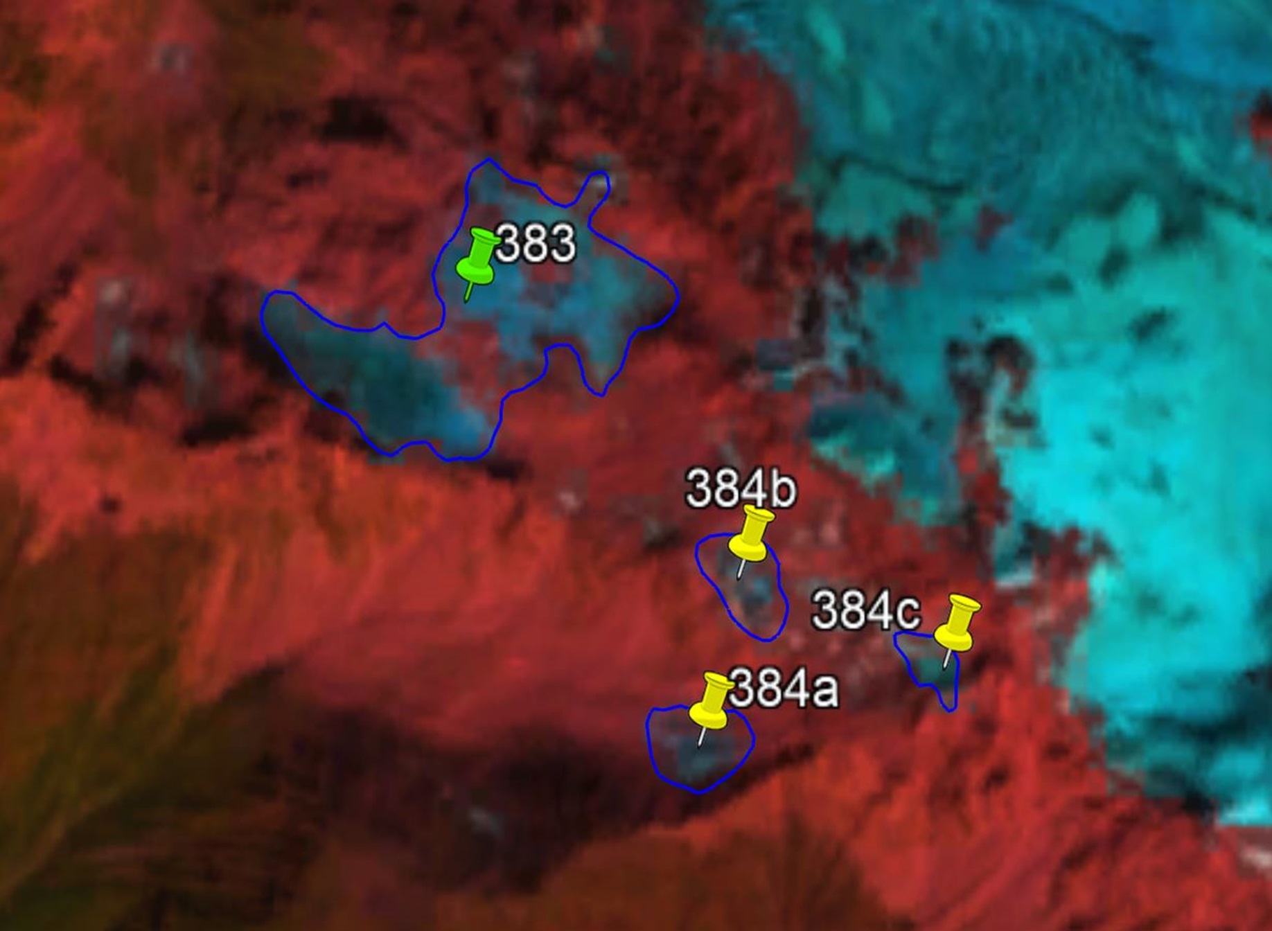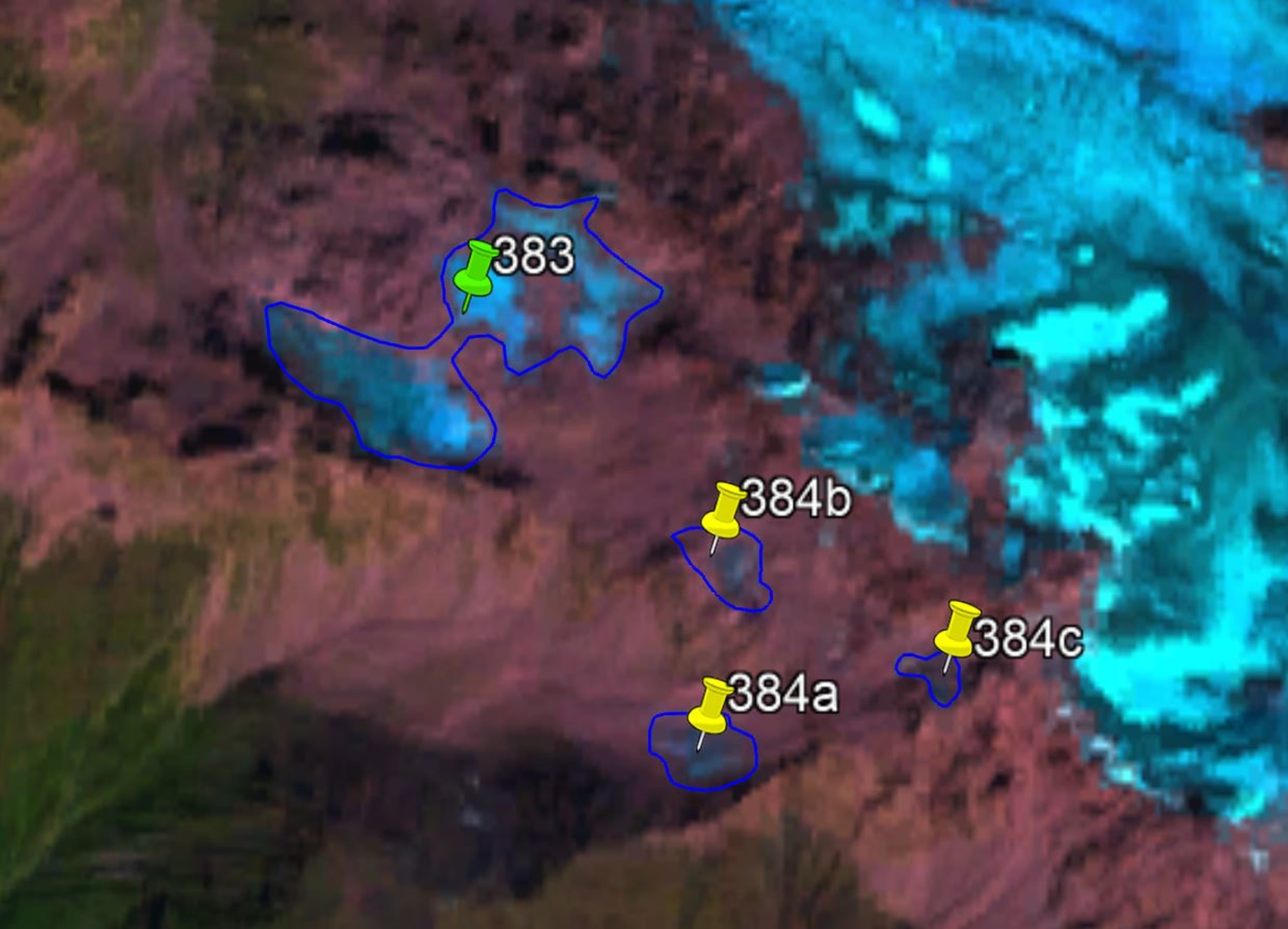 სურ. 19. №383 და №384 მყინვარების კონტურები: ა − ტოპოგრაფიული რუკის მიხედვით, ბ − Landsat 7 ETM+ სენსორის 2010 წლის 31 აგვისტოს სურათის მიხედვით, გ − Landsat 8 OLI TIRS სენსორის 2015 წლის 5 სექტემბრის სურათის მიხედვით, დ − Landsat 8 OLI TIRS სენსორის 2020 წლის 11 სექტემბრის სურათის მიხედვით.