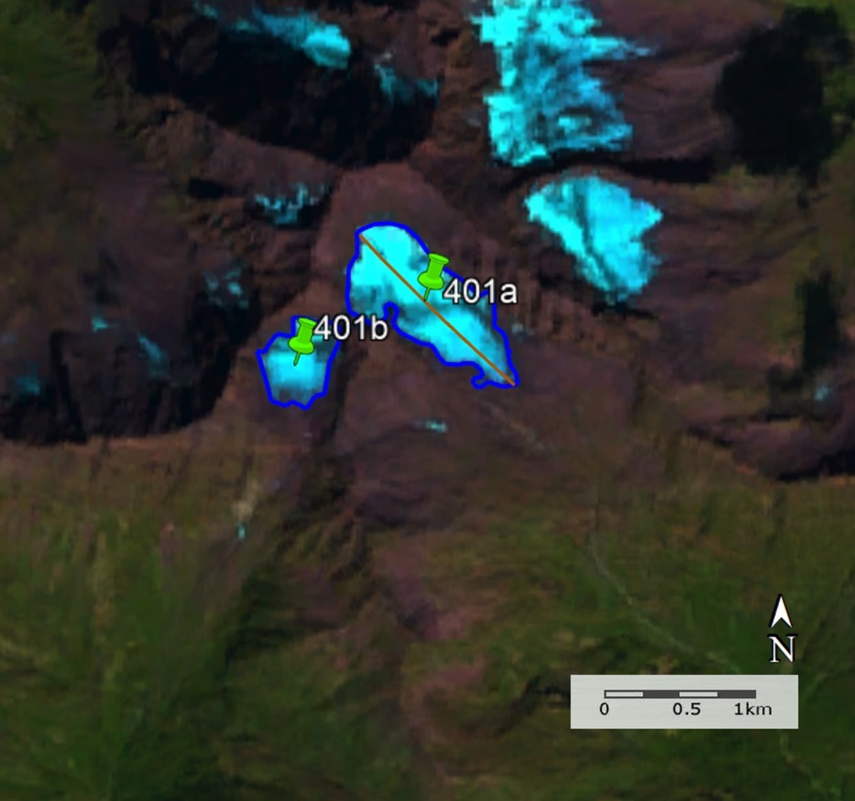სურ. 28. მდინარე ჯეჯორას №401 (საუხოხი) მყინვარის კონტურები: ა − ტოპოგრაფიული რუკის მიხედვით, ბ − Landsat 7 ETM+ სენსორის 2011 წლის 11 აგვისტოს სურათის მიხედვით, გ − Landsat 8 OLI სენსორის 2017 წლის 12 სექტემბრის სურათის მიხედვით, დ − Landsat 8 OLI TIRS სენსორის 2020 წლის 4 სექტემბრის სურათის მიხედვით.