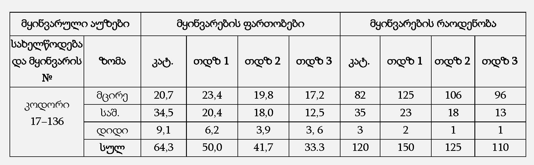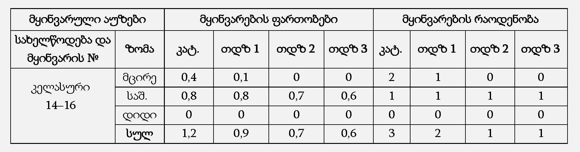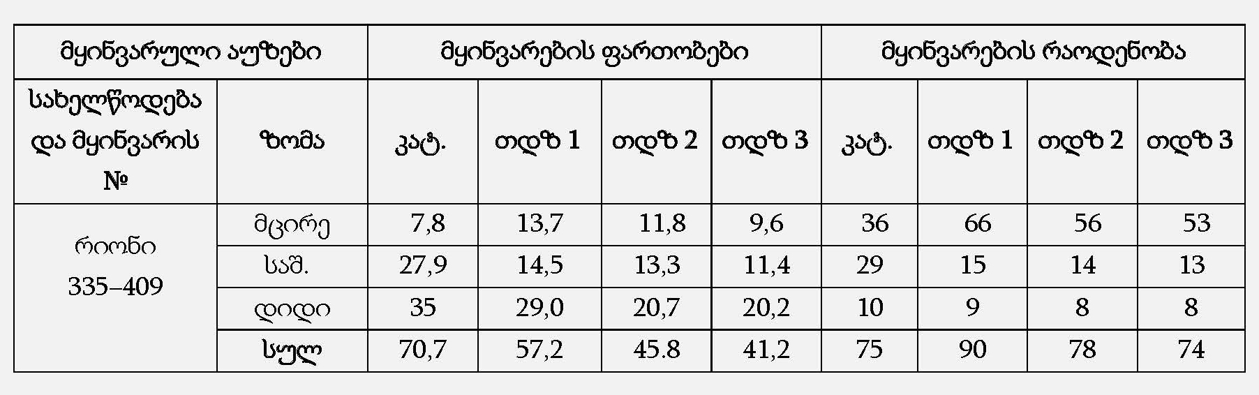 დასავლეთ საქართველოში 6 მყინვარულ აუზში კატალოგის მიხედვით სულ აღრიცხულია 409 მყინვარი. მათი ჯამური ფართობია 465,7 კმ2 [26]. 2010 წელს ამ მყინვარების ფართობი გახდა 384,4 კმ2, 2015 წელს − 318,7 კმ2, ხოლო 2020 წელს − 274.9 კმ2. რაც იმას ნიშნავს, რომ მყინვარების საერთო ფართობი 60 წლის განმავლობაში შემცირდა 81.3 კმ2-ით ანუ 17.5 %-ით, კიდევ 5 წლის შემდეგ შემცირდა 17.1 %-ით, ხოლო კიდევ 5 წლის შემდეგ შემცირდა 47.5-ით ანუ 13.7 %-ით. ჯამური ფართობი (კატალოგით) 465.7 კმ2 2020 წლისათვის გახდა 274.9 კმ2 ანუ შემცირდა 190.8 კმ2-ით (41.0 %-ით).